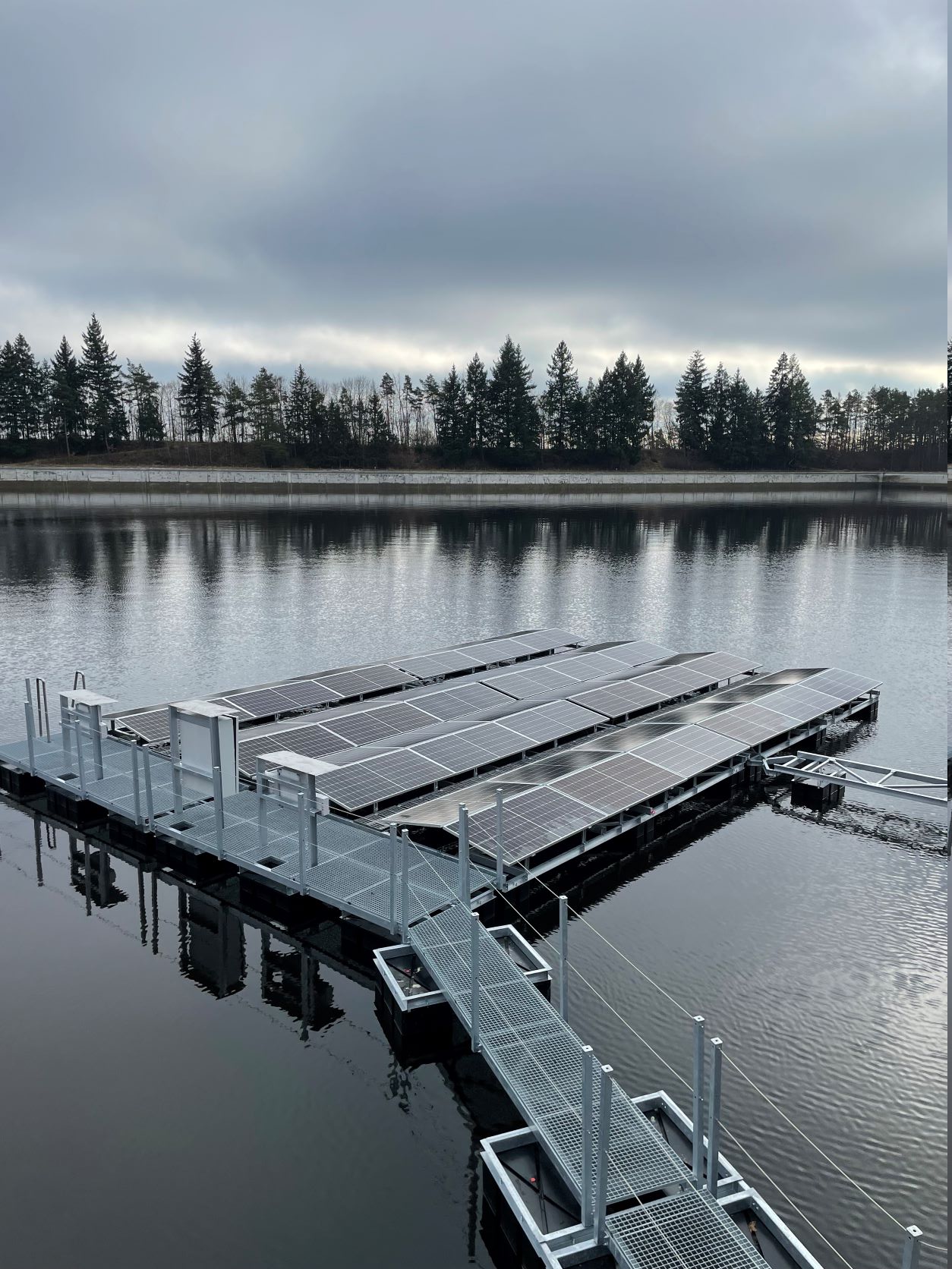 The Štěchovice pumped-storage power plant, a valuable emergency source, is now gaining further importance. A jigsaw puzzle in the form of four rows of monocrystalline photovoltaic panels was created, thanks to the cooperation of ČEZ Obnovitelné zdroje, PRODECO, and ČEZ hydro power plants. The so-called roofs with east-west orientation are held above the surface of the upper reservoir by more than thirty air-filled floats with a capacity of over 6 tonnes. To withstand the vagaries of the weather and the constant movement of the reservoir level, which is determined by the operation of the pumped-storage power plant, the entire structure is fixed to moving girders mounted on the reservoir walls.
