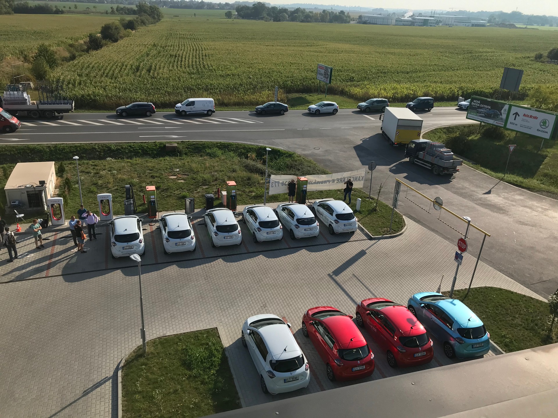 TWELVE RENAULTS SURROUNDED A TRIO OF FAST CHARGERS AT THE D0 MOTORWAY FOR TWO HOURS. THE BATTERY SYSTEM WITH PHOTOVOLTAICS AT THE BACK HAS WITHSTOOD THE ONSLAUGHT!
